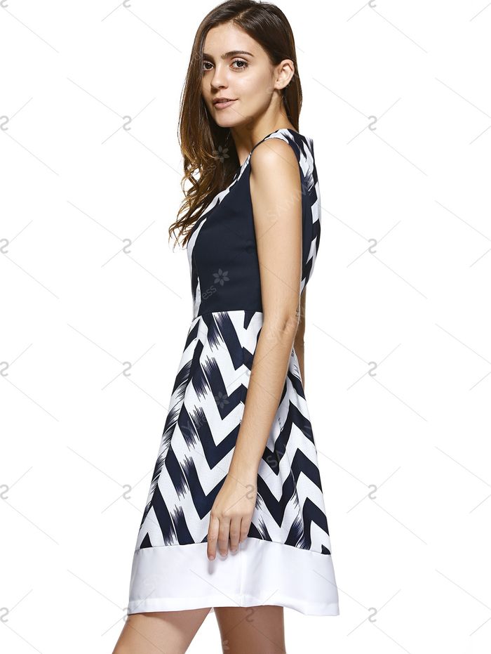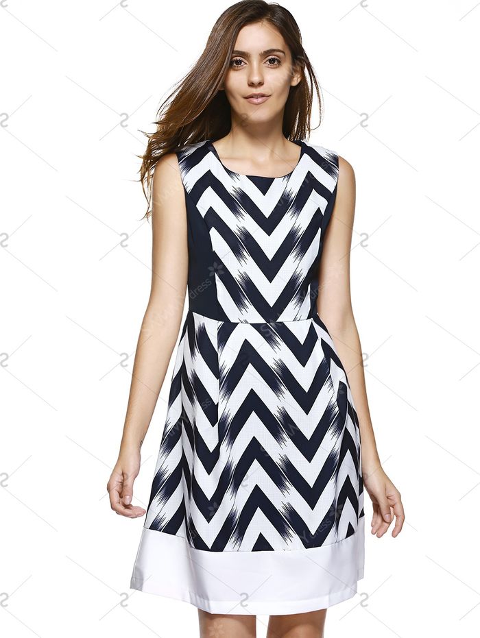 时尚之字形条纹和火焰无袖连衣裙的妇女